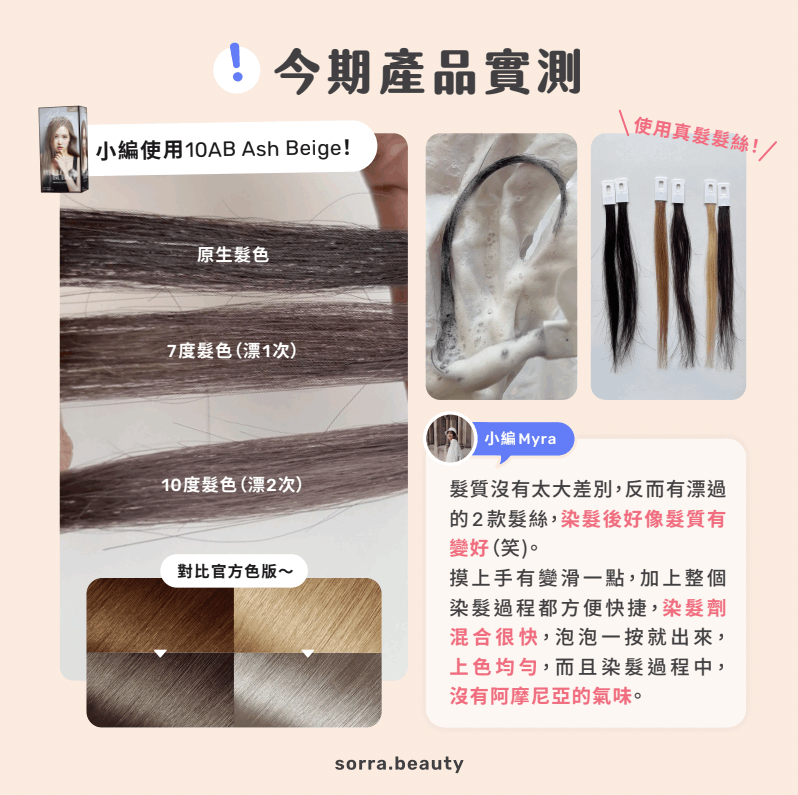 髮質沒有太大差別,反而有漂過的2款髮絲,染髮後好像髮質有變好(笑)摸上手有變滑一點,加上整個染髮過程都方便快捷,染髮劑混合很快,泡泡一按就出來,上色均勻,而且染髮過程中,沒有阿摩尼亞的氣味。