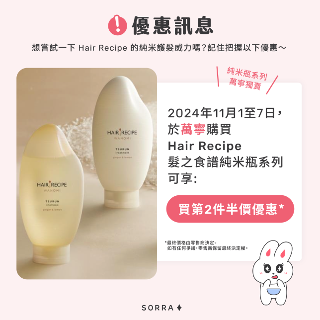 想嘗試一下Hair Recipe的純米護髮威力嗎?記住把握以下優惠~