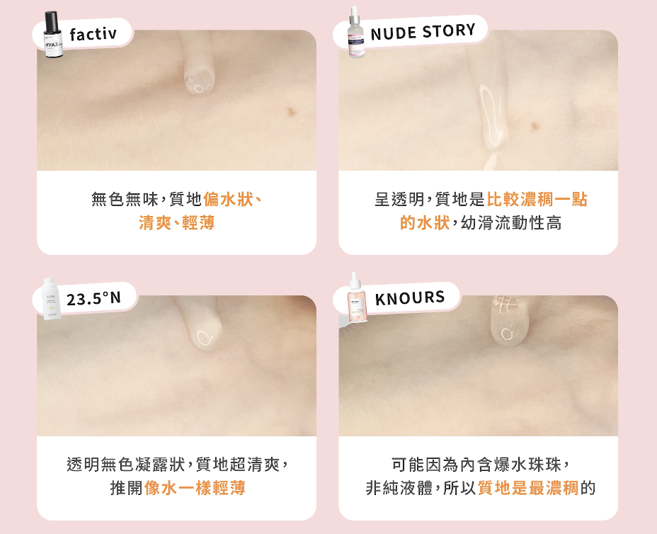 factiv HYA3 補濕精華無色無味,質地偏水狀、清爽、輕薄;NUDE STORY 白玫瑰強效保濕精華呈透明,質地是比較濃稠一點的水狀,幼滑流動性高;23.5°N 桂竹活水精華液是透明無色凝露狀,質地超清爽,推開像水一樣輕薄;KNOURS 粉紅玫瑰泡泡爆水精華可能因為內含爆水珠珠,非純液體,所以質地是最濃稠的。