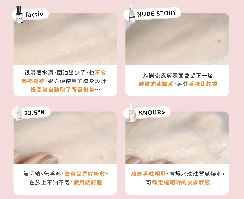 factiv HYA3 補濕精華很滑很水潤,面油出少了,也不會起擦膠碎。很方便使用的樽身設計,扭開就自動取了所需份量~NUDE STORY 白玫瑰強效保濕精華推開後皮膚表面會留下一層輕微的油膩感,另外香味比較重;23.5°N 桂竹活水精華液無酒精、無香料,清爽又是好吸收,在臉上不油不悶,使用感舒服;KNOURS 粉紅玫瑰泡泡爆水精華玫瑰香味明顯,有爆水珠珠質感特別,可能穩定經期時的皮膚狀態。
