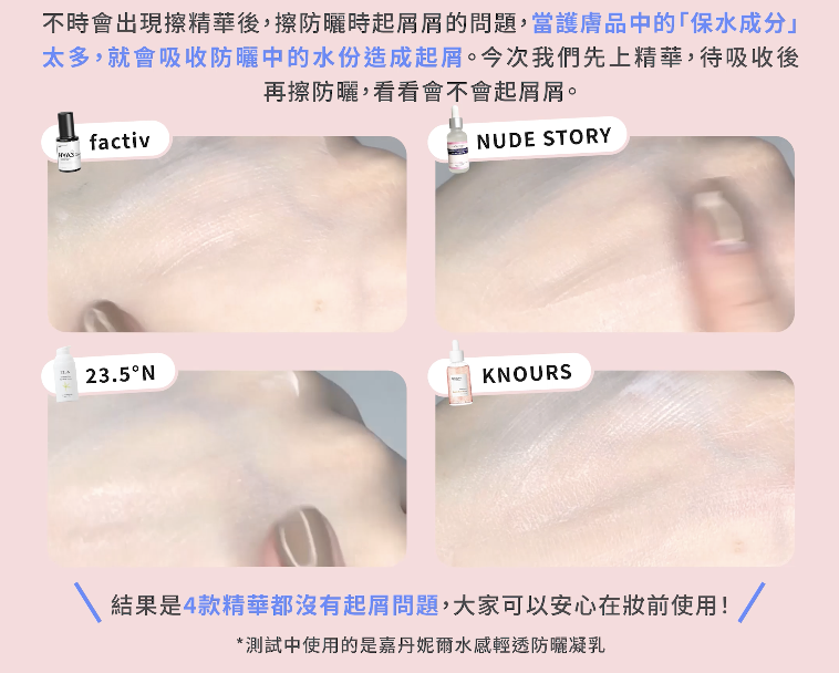 不時會出現擦精華後,擦防曬時起屑屑的問題,當護膚品中的「保水成分」太多,就會吸收防曬中的水份造成起屑。今次我們先上精華,待吸收後再擦防曬(測試中使用的是嘉丹妮爾水感輕透防曬凝乳),看看會不會起屑屑。結果是4款精華都沒有起屑問題,大家可以安心在妝前使用!