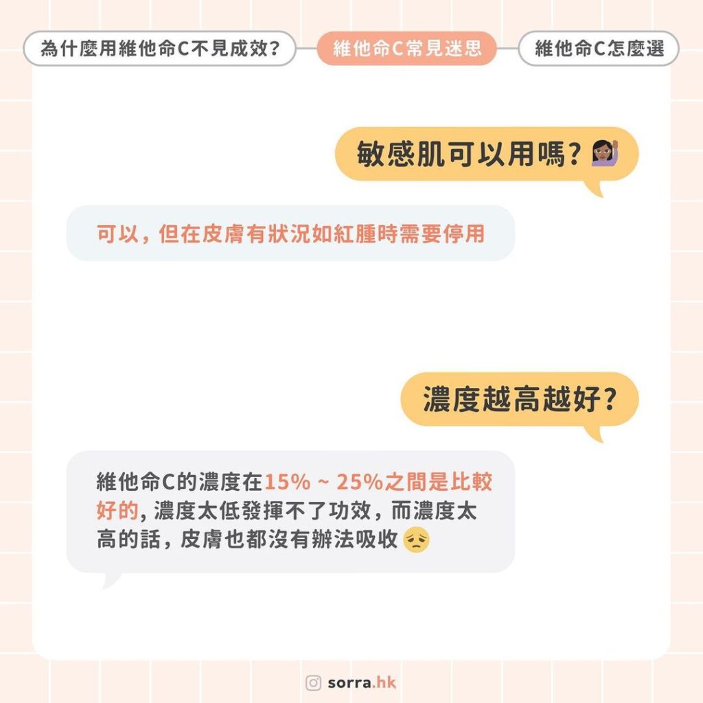 維他命C的濃度在15% ~ 25%之間是比較好的, 濃度太低發揮不了功效, 而濃度太高的話, 皮膚也都沒有辦法吸收。