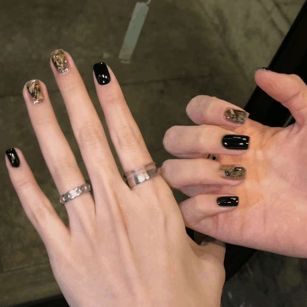 較小眾的暗黑風,利用黑色底膠貼上不規則「碎玻璃」亮片,危險又迷人。