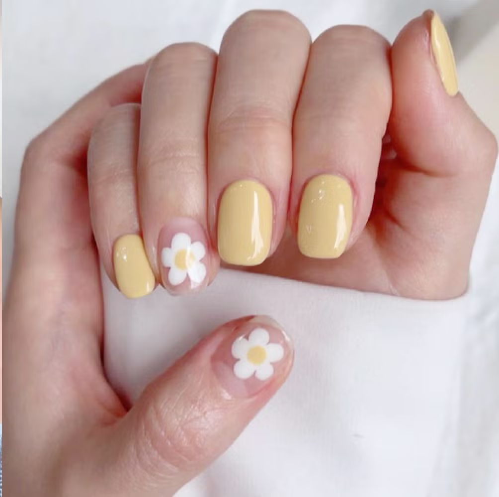 柔和的奶油黃色為底,搭配手繪白色小雛菊或向日葵,像是把夏日花園搬到指尖。適合搭配碎花洋裝或草編帽,推薦給喜歡鄉村風格的女生,短圓甲型更能突顯可愛感。