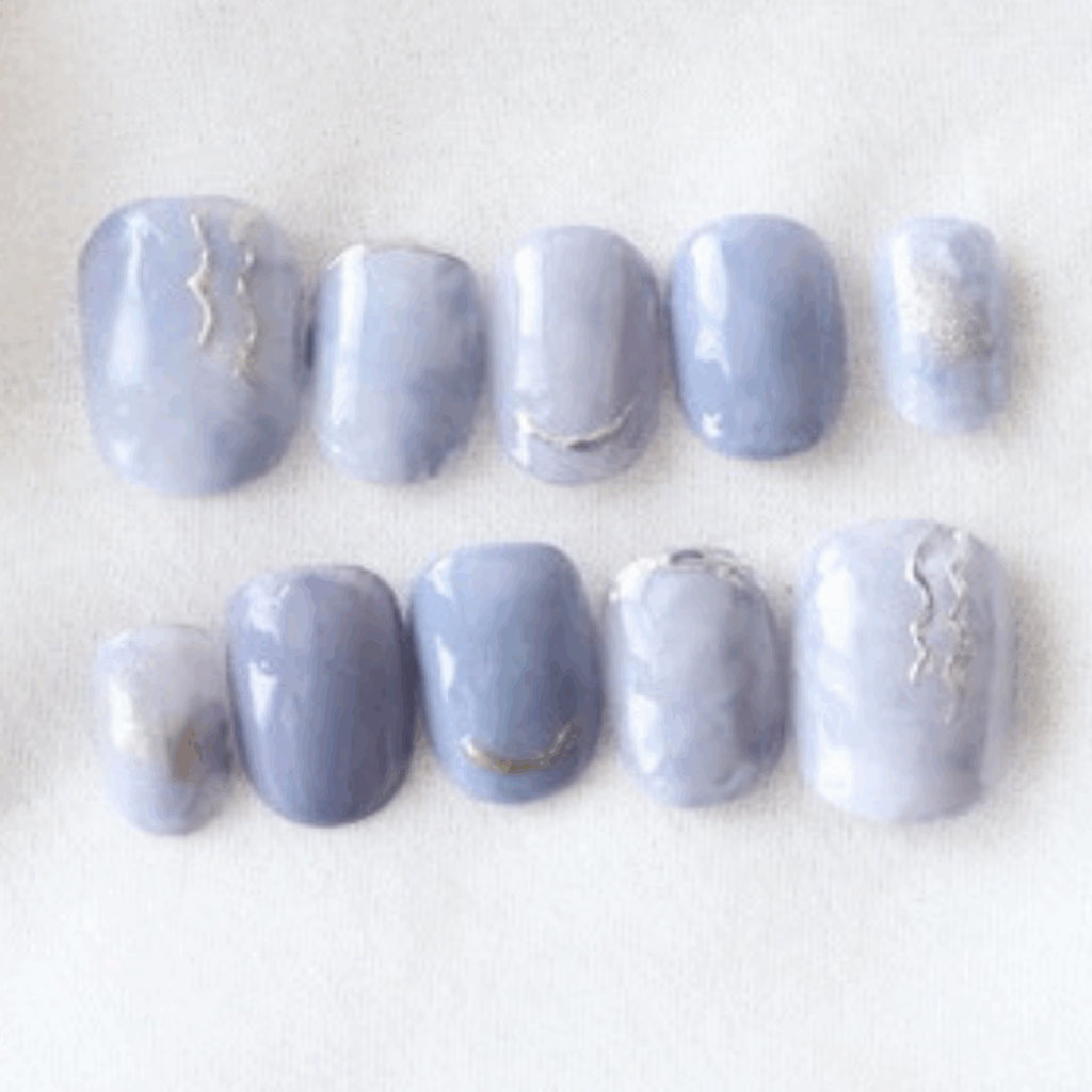 灰藍色與白色為底,描繪細緻的青花瓷紋路或山水墨線條,充滿和風韻味。適合橢圓形或杏仁甲,低調卻有藝術感,推薦給喜歡簡約日系穿搭的女生,搭配亞麻布料更顯質感。