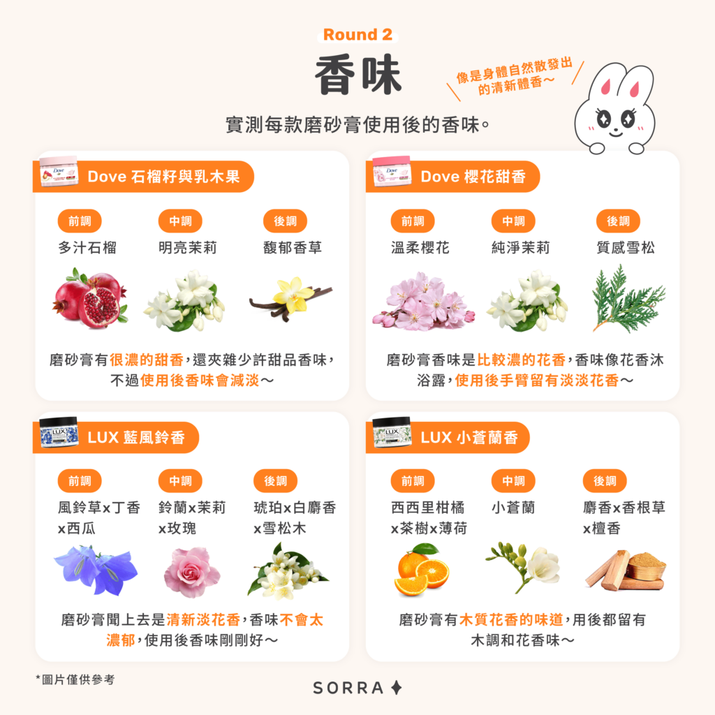 磨砂膏香味是比較濃的花香,香味像花香沐浴露,使用後手臂留有淡淡花香~