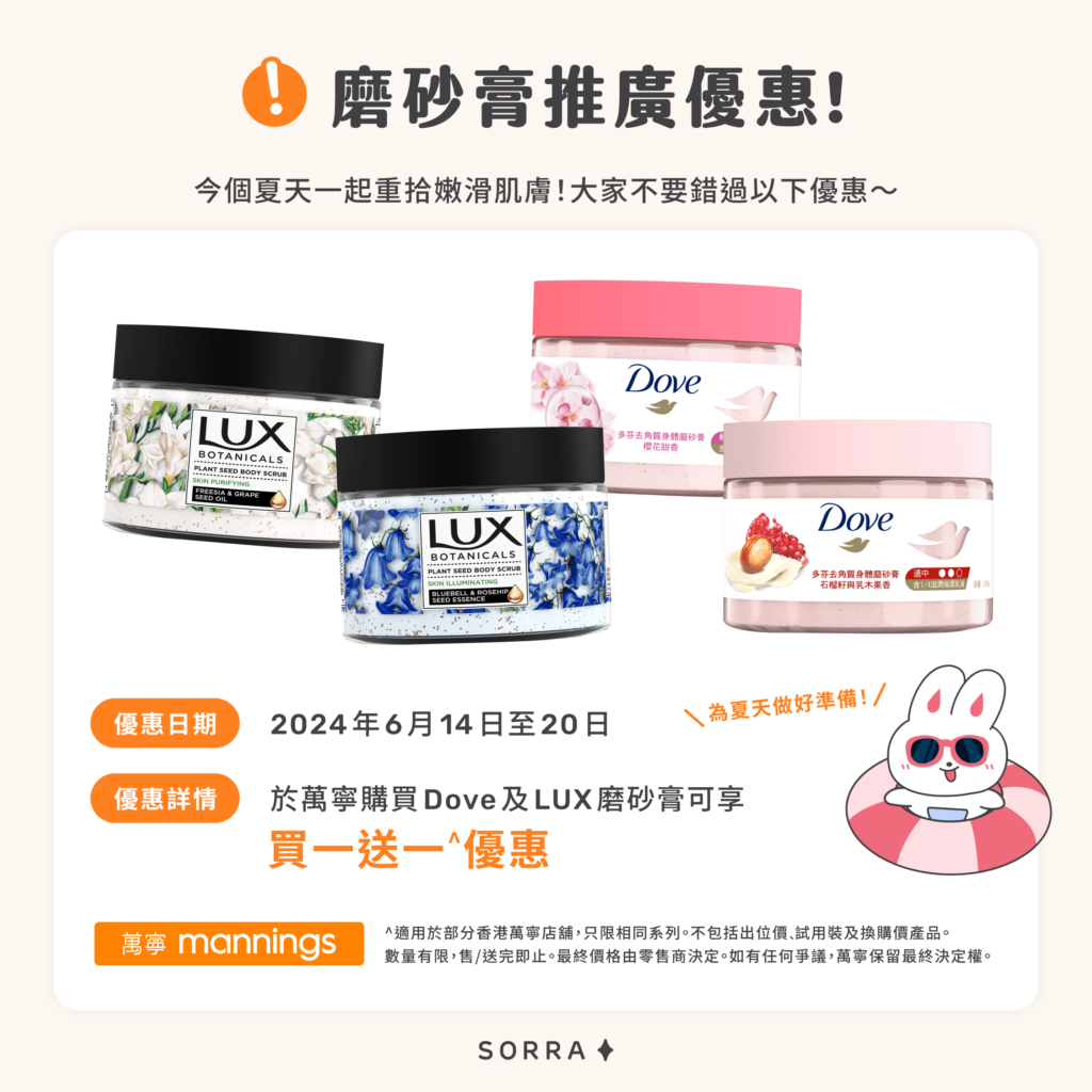 優惠:於萬寧購買Dove及LUX磨砂膏可享買一送一^優惠