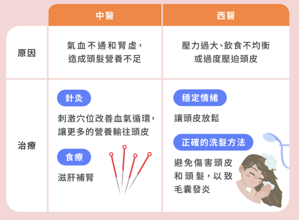 中醫和西醫角度看脫髮問題的成因和治療方法都截然不同,到底如何拯救脫髮危機?中醫認為是因為氣血不通和腎虛,造成頭髮營養不足。可以透過針灸刺激穴位改善血氣循環,讓更多的營養輸往頭皮,或進依滋肝補腎的食物;而西醫則認為壓力過大、飲食不均衡或過度壓迫頭皮,建議穩定情緒,讓頭皮放鬆,以及使用正確的洗髮方法,可以避免傷害頭皮和頭髮,以致毛囊發炎。