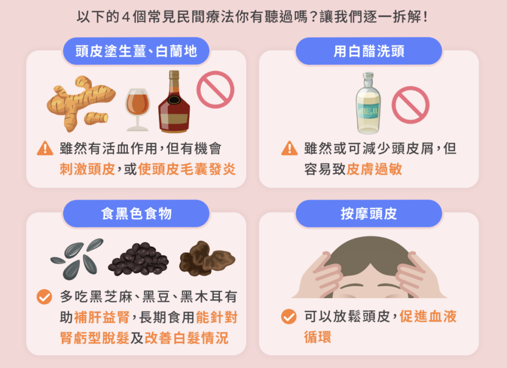 頭皮塗生薑和白蘭地雖然有活血作用,但使用時有機會刺激頭皮,甚至引起頭皮毛囊發炎的風險。同樣地,使用白醋洗頭雖然或可減少頭皮屑,但容易引起皮膚過敏反應。如果你希望改善頭皮健康,建議多食用黑色食物,例如黑芝麻、黑豆和黑木耳,這些食物有助於補肝益腎,長期食用還能針對腎虧型脫髮及改善白髮情況。此外,按摩頭皮也是一種有效的方式,可以放鬆頭皮,並促進血液循環,進而改善頭皮的健康狀態。