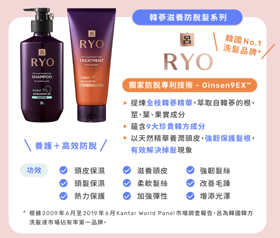 韓國 No.1 洗髮品牌*,採用了【呂RYO】獨家防脫專利技術 - Ginsen9EX™,提煉全枝韓蔘精華,萃取自韓蔘的根、莖、葉、果實成分,蘊含9大珍貴韓方成分,以天然精華養潤頭皮,強韌保護髮根,一次有效解決掉髮、毛躁問題,更可以柔軟髮絲、加強彈性、強韌髮絲。
