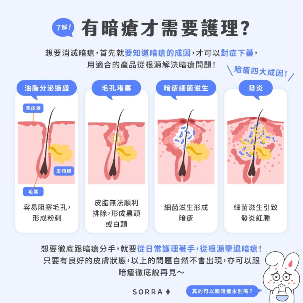 想要消滅暗瘡,首先就要知道暗瘡的成因,才可以對症下藥,用適合的產品從根源解決暗瘡問題!