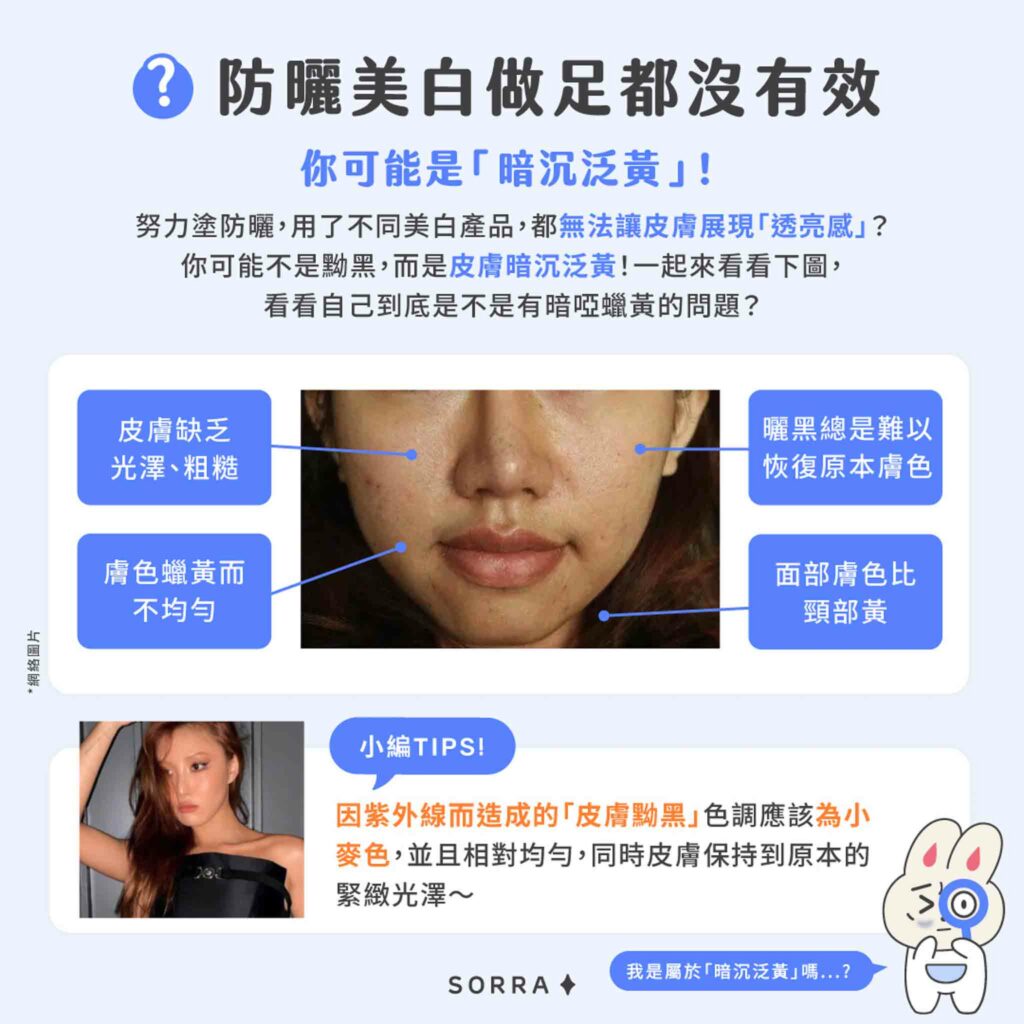 -膚色蠟黃而不均勻>曬黑總是難以恢復原本膚色