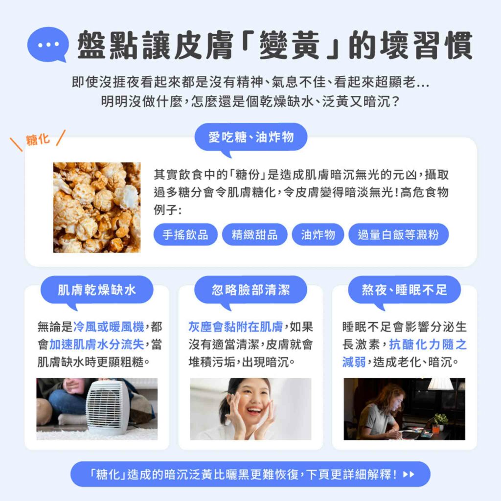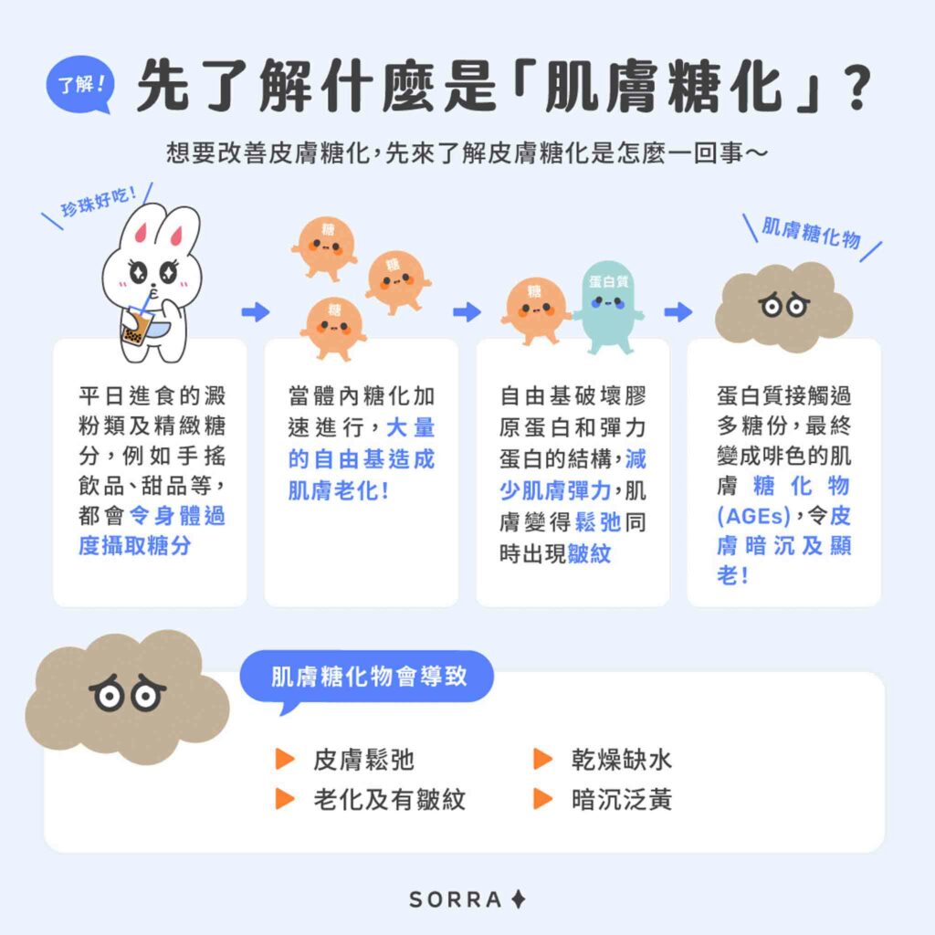 平日進食的澱粉類食物及精緻糖分,例如手搖飲品、甜品、炸物,都會令身體過度攝取糖分,當體內糖化加速進行,大量的自由基造成肌膚老化,破壞膠原蛋白和彈力蛋白的結構,減少肌膚彈力,肌膚變得鬆弛同時會有皺紋,蛋白質接觸過多糖份,最終變成啡色的肌膚糖化物(AGEs),令皮膚暗沉及顯老!