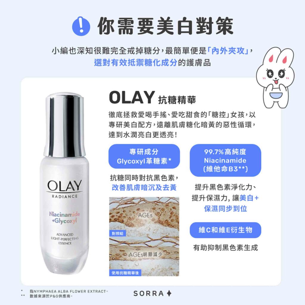 ✔專研成分Glycoxyl 革糖素* - 抗糖同時對抗黑色素,改善肌膚暗沉及去黃