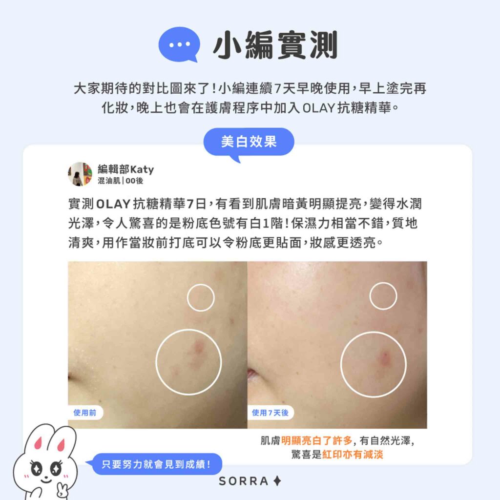 小編Katy:實測了OLAY抗糖精華7日,用起來好清爽,即時感受到臉上保濕度加強,持續使用後感覺臉部慢慢變白,變得水潤光澤。可以當妝前打底,之後上粉底時更貼面,妝感更透亮,適合早晚都使用~