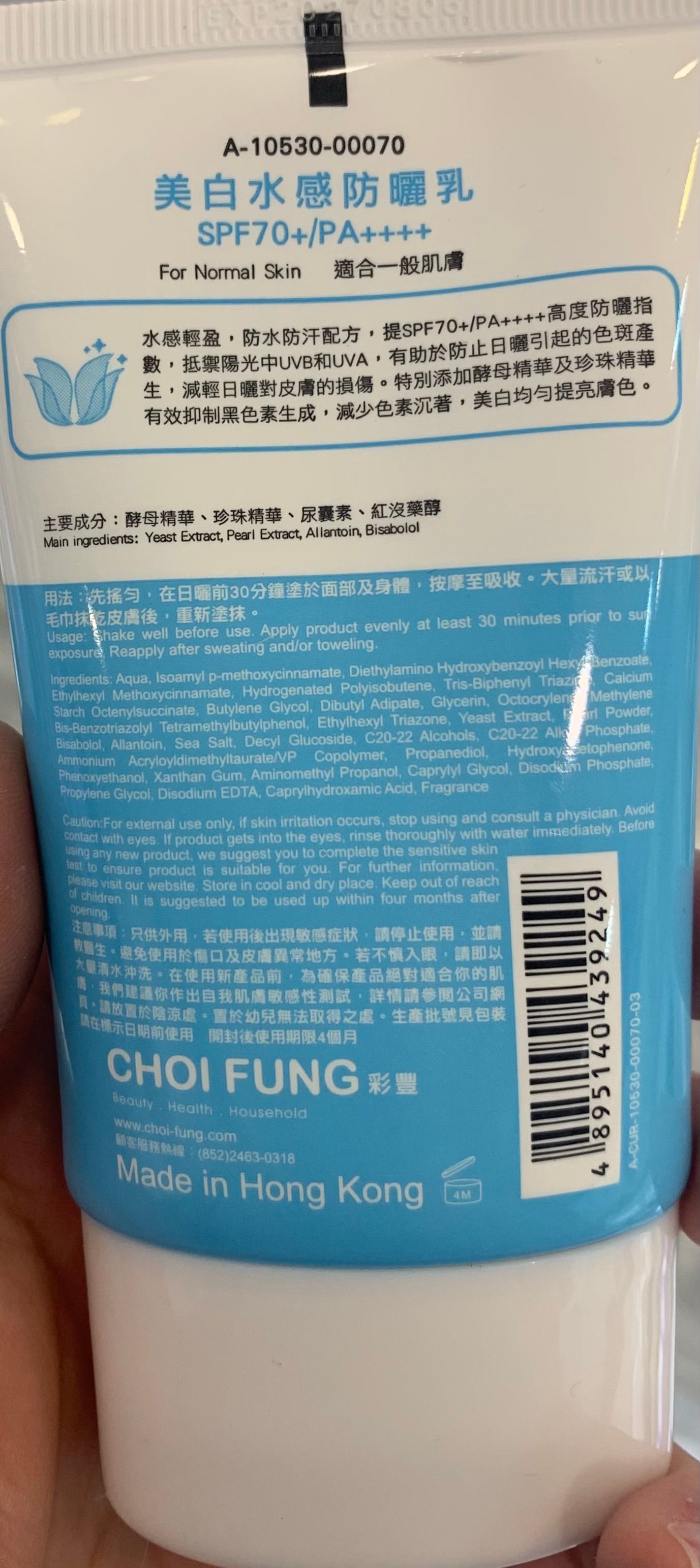 另外,有洋甘菊、川楝子精華、藥蜀葵精華、人參精華同尤加利精華,係防曬期間,同時做到保濕,抑制黑色素生成,預防黑斑及色斑。