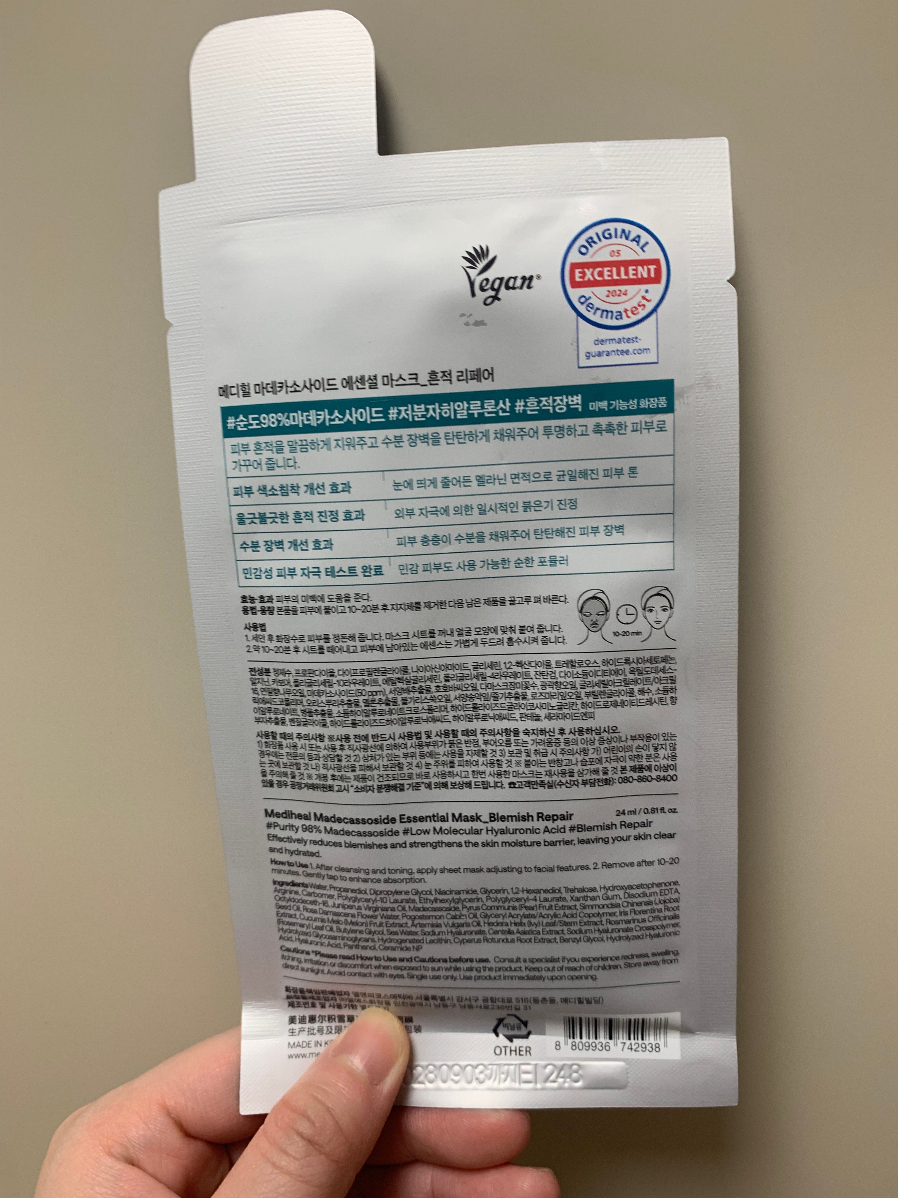 其主打高濃度積雪草苷,敷15分鐘就能明顯淡化痘印、紅腫,同時抑制黑色素、均亮膚色。面膜紙超薄服貼,好多精華液。精華完全不黏膩,過左一陣過,都好快被皮膚吸收。連續敷3天,痘印淡一階、泛紅鎮定,係一款唔錯的面膜之選。